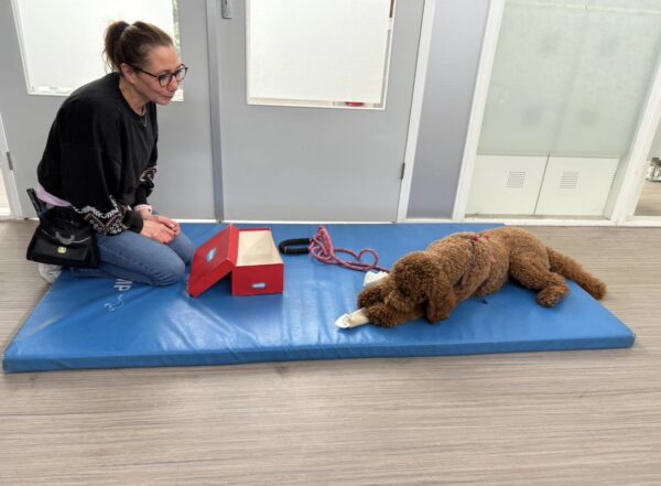 - Trucjes laten doen: Met hulp van de begeleider de hond laten “zitten”, “pootje geven” of “blijf” laten doen.